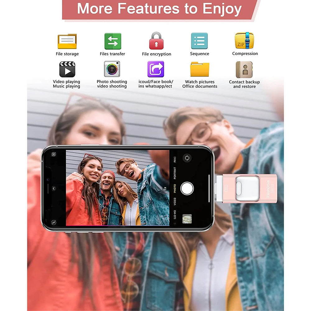 This Flash Drive, USB Memory Stick External Storage Thumb Drive Compatible with iPhone, iPad, Android, PC and More Devices.