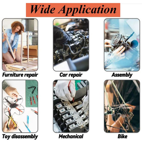 Suitable for furniture repair, automobile repair, bikes, assembly & disassembly, household DIY, construction sites, industrial use, and more.